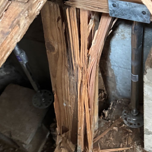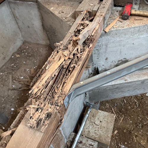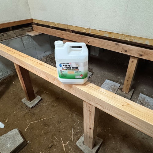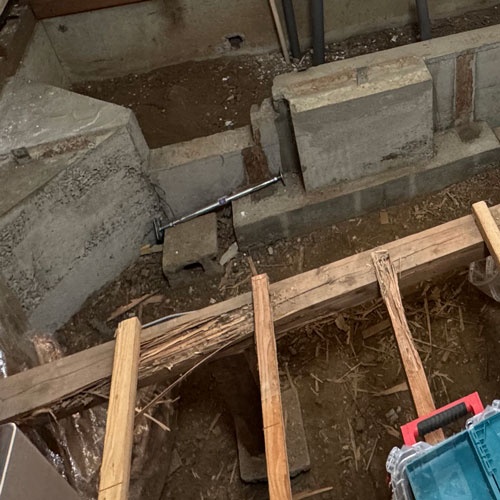 いたる所の木材が既にシロアリに食べられており、シロアリ自体は既にいなく、床下の基礎が根太、大引き、束柱に至るまで悪くなっているために床下から直すことになりました。 被害が台所を中心多く広がっているため、まずはシロアリを除去と駆除後、床下の基礎を解体してから復旧する事となりました。台所を毎日使う問題もあり半面ずつ工事を行う必要があります。