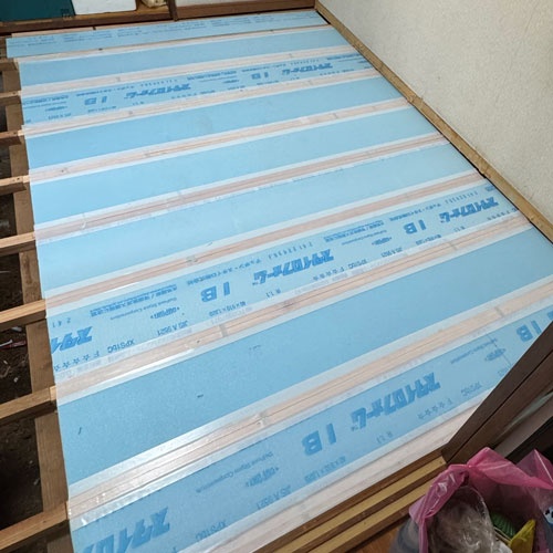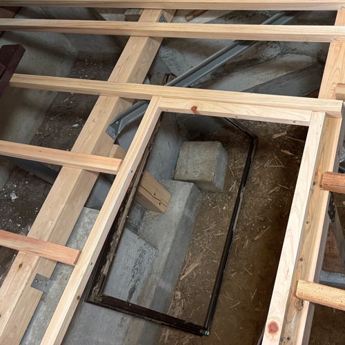 床のフローリングを剥がして、基礎部分を解体後、床下基礎組と床高のレベル調整を行い既に遭わないところはジャッキアップを行なってレベルを合わせた後に、新しい束柱と大引きへ交換し根太の交換を行いシロアリ対策に再度被害に遭わないよう防腐剤塗布しました。耐震補強や断熱剤も新しく入れて将来に備えます。床の修繕は、いろいろな修理方法がございますのでお気軽にご相談ください。