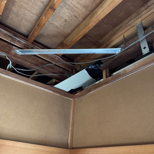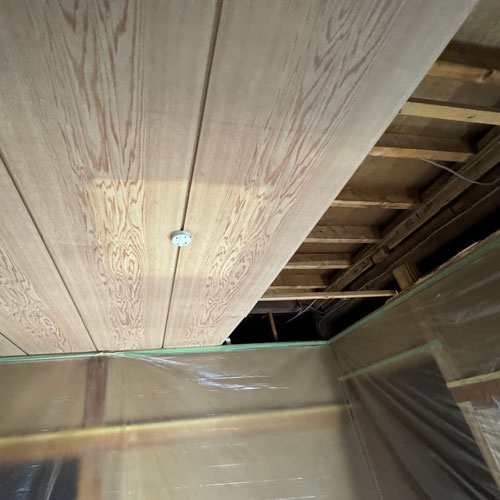 天井の中天を見てみると、以前の屋根の構造がわかります。従来の在来住宅(30年〜50年以上)の天井は、野ぶちも少なく断熱材も入っていない為のが主流なので解体も半日から1日程度で終わります。