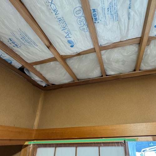 和室の冬が寒いのと雨漏れ跡が気になると相談受けて、天井を直したいという要望がありましたので、本日は天井の修理に来ました。老朽化により少し天井がたるみがありおかしいのかなと思いつつ天井を解体し、1階と2階の間の中天しに入ってみると古い家なので野ぶちもなく、断熱材も入っていないので修理することになりました。